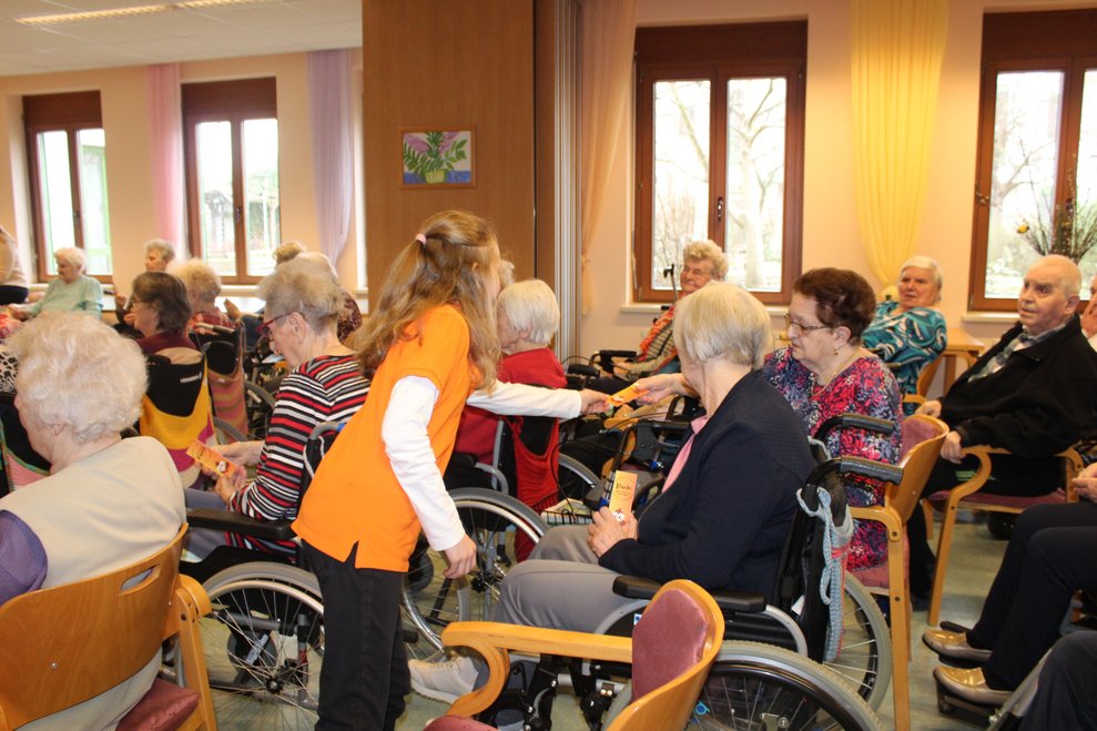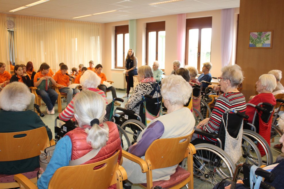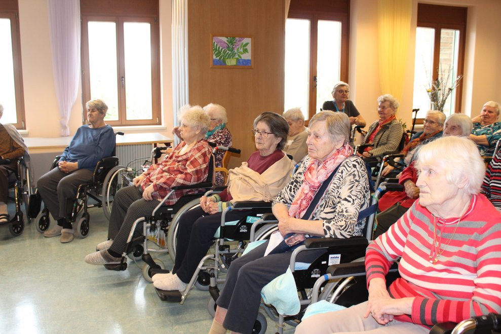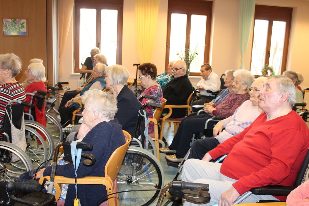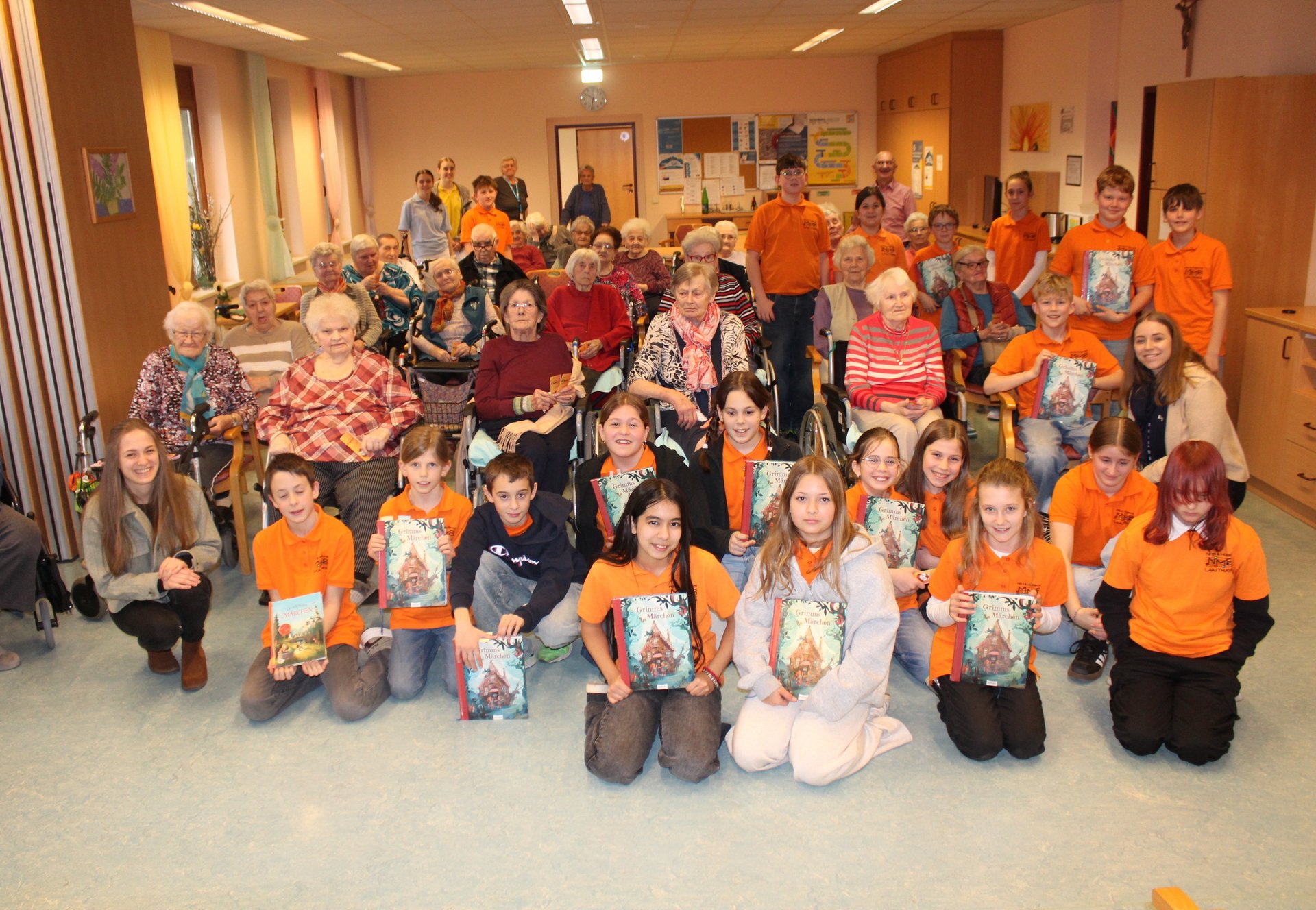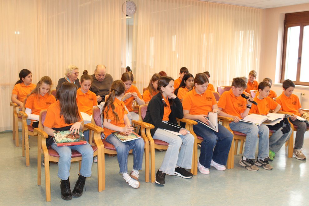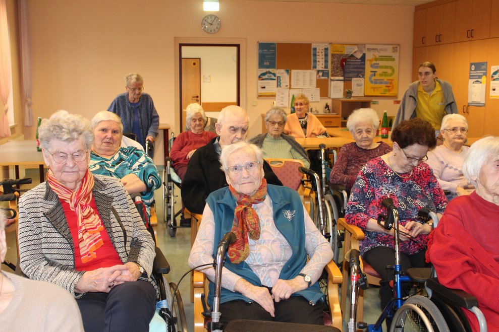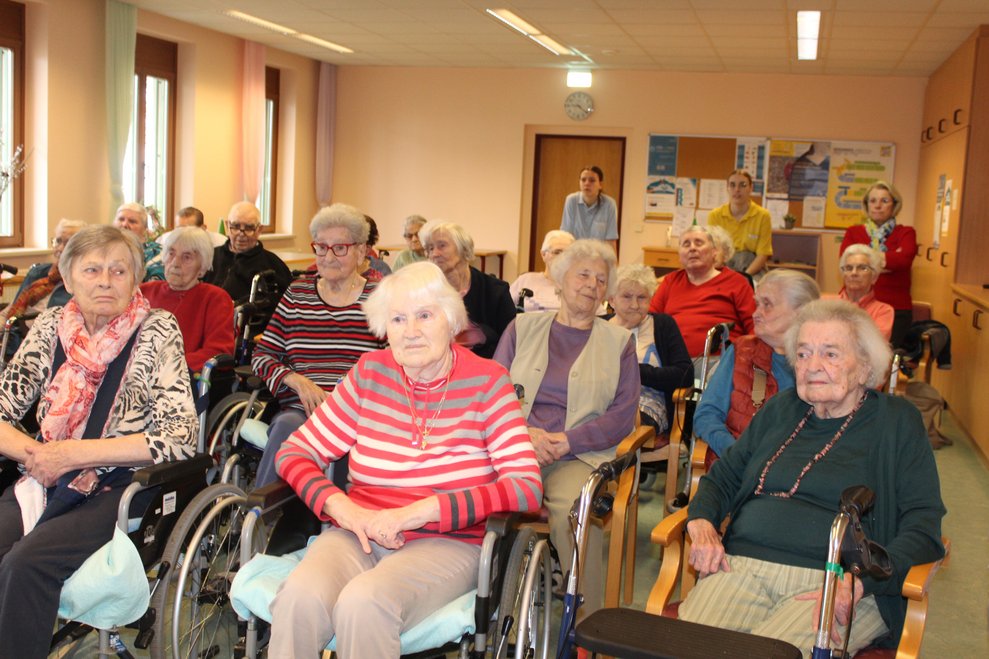 Eine Klasse der Musikmittelschule Laa kam zur Märchenstunde in unser Haus. Die Schülerinnen und Schüler holten unsere Bewohnerinnen und Bewohner von den Wohnbereichen in den Spiegelsaal. Es wurde eine große Runde. Viele bekannte Märchen wurden vorgelesen und es wurde gebannt zugehört. Man kann sich ja schon gar nicht mehr an die Märchen erinnern, stellten die Bewohnerinnen und Bewohner fest. Zur Erinnerung überreichten die Schülerinnen und Schüler unseren Bewohnerinnen und Bewohnern ein Lesezeichen. Danach wurden wieder alle auf die Wohnbereiche gebracht und es gab noch das eine oder andere Erinnerungsfoto.