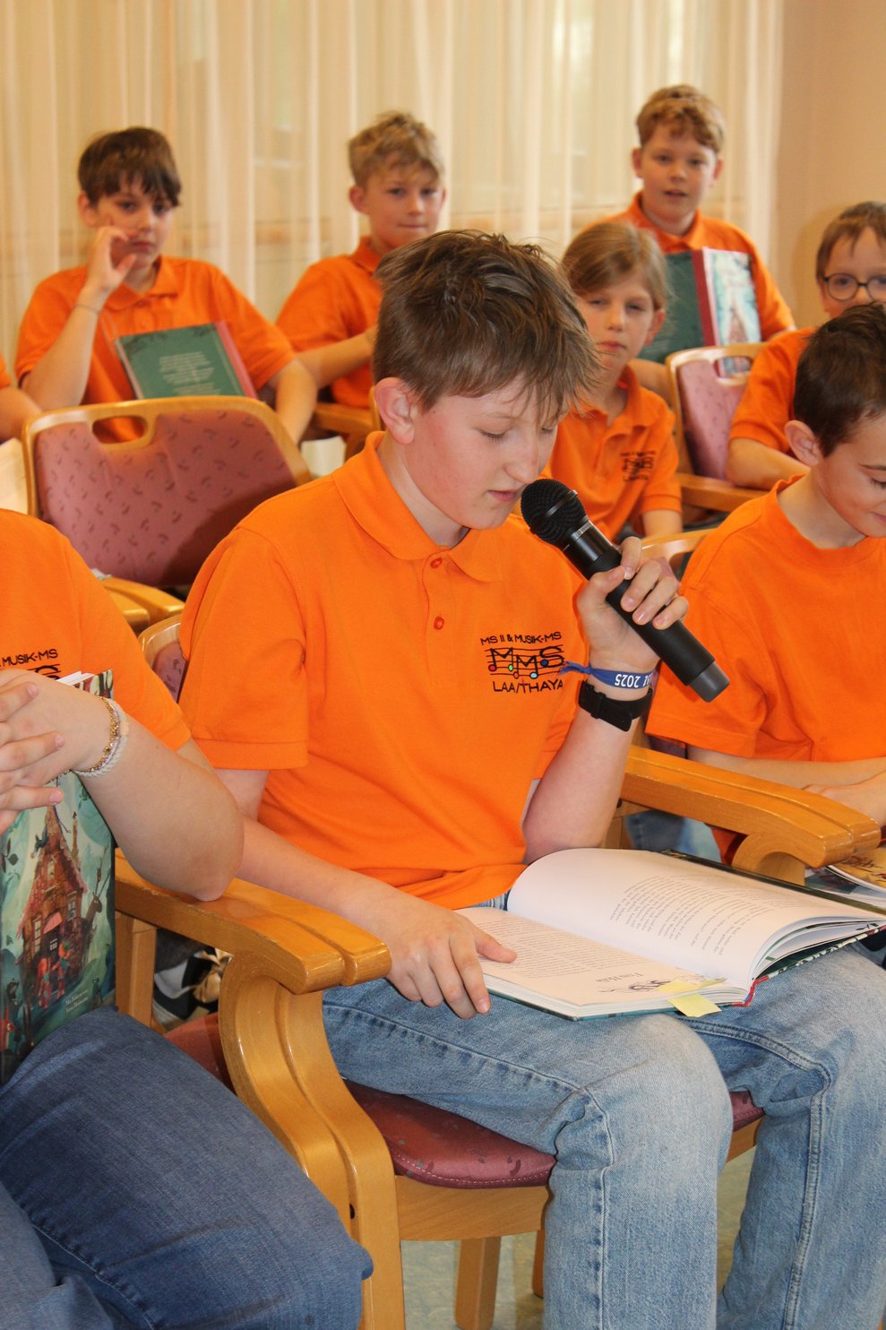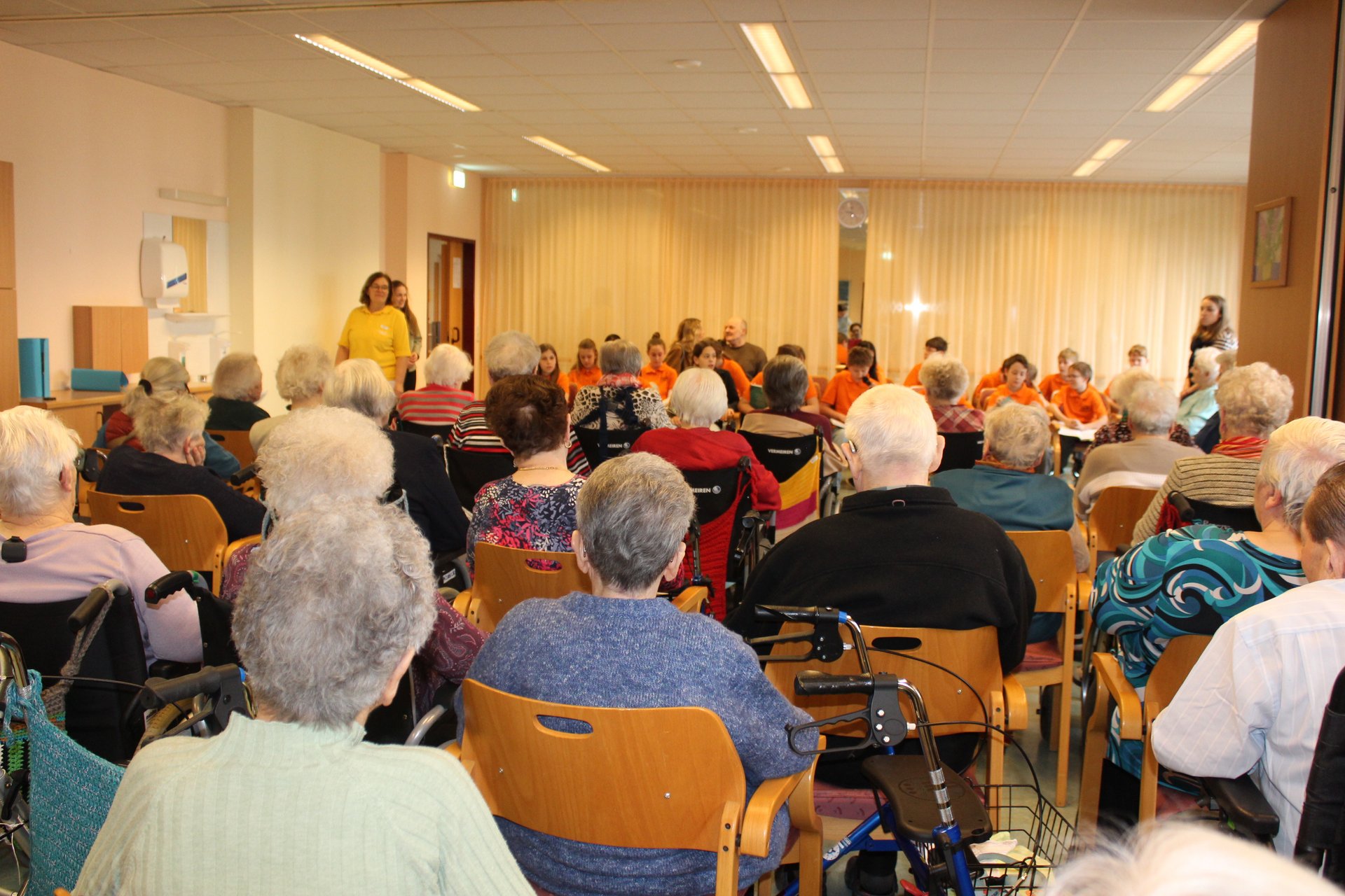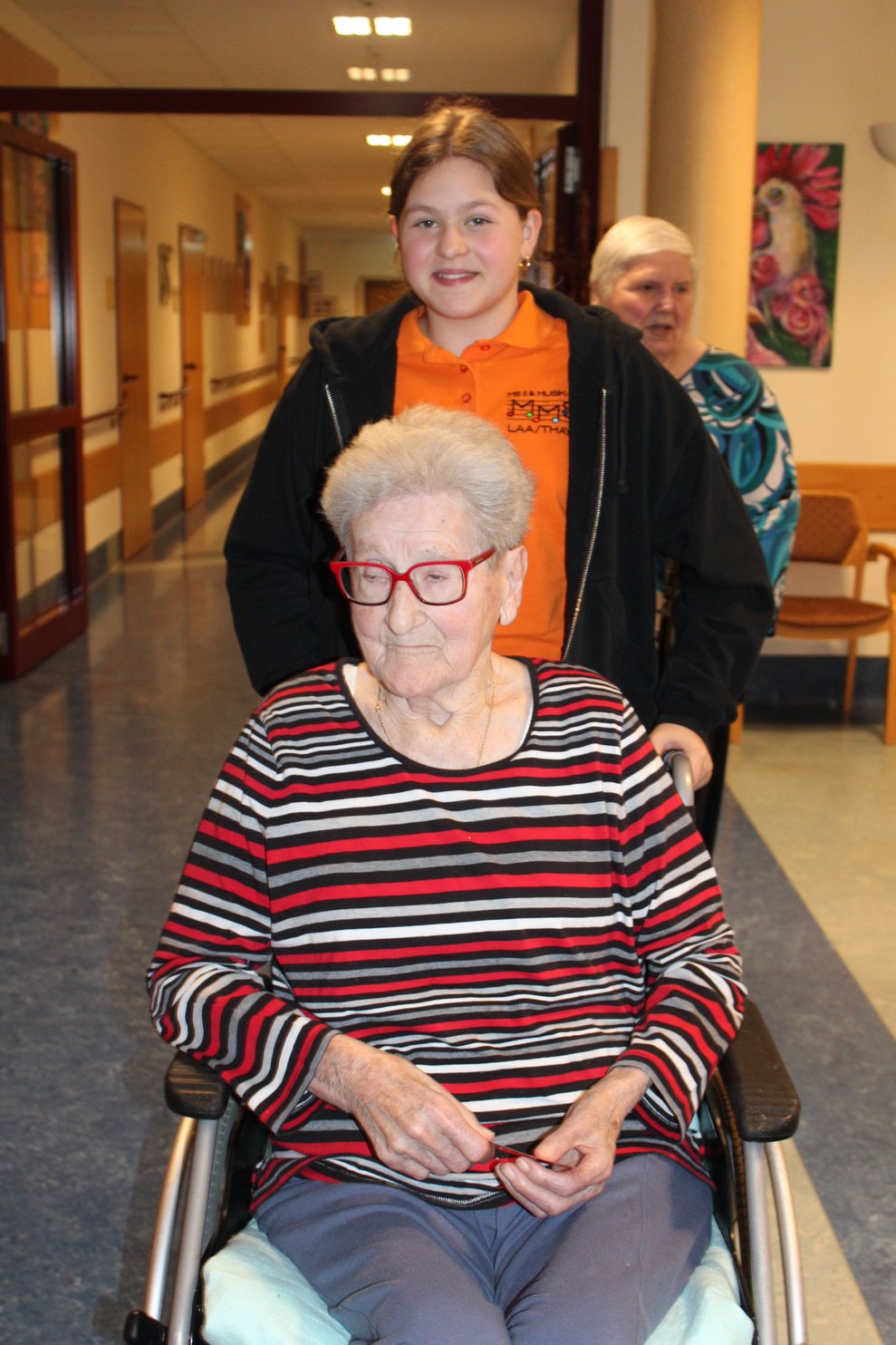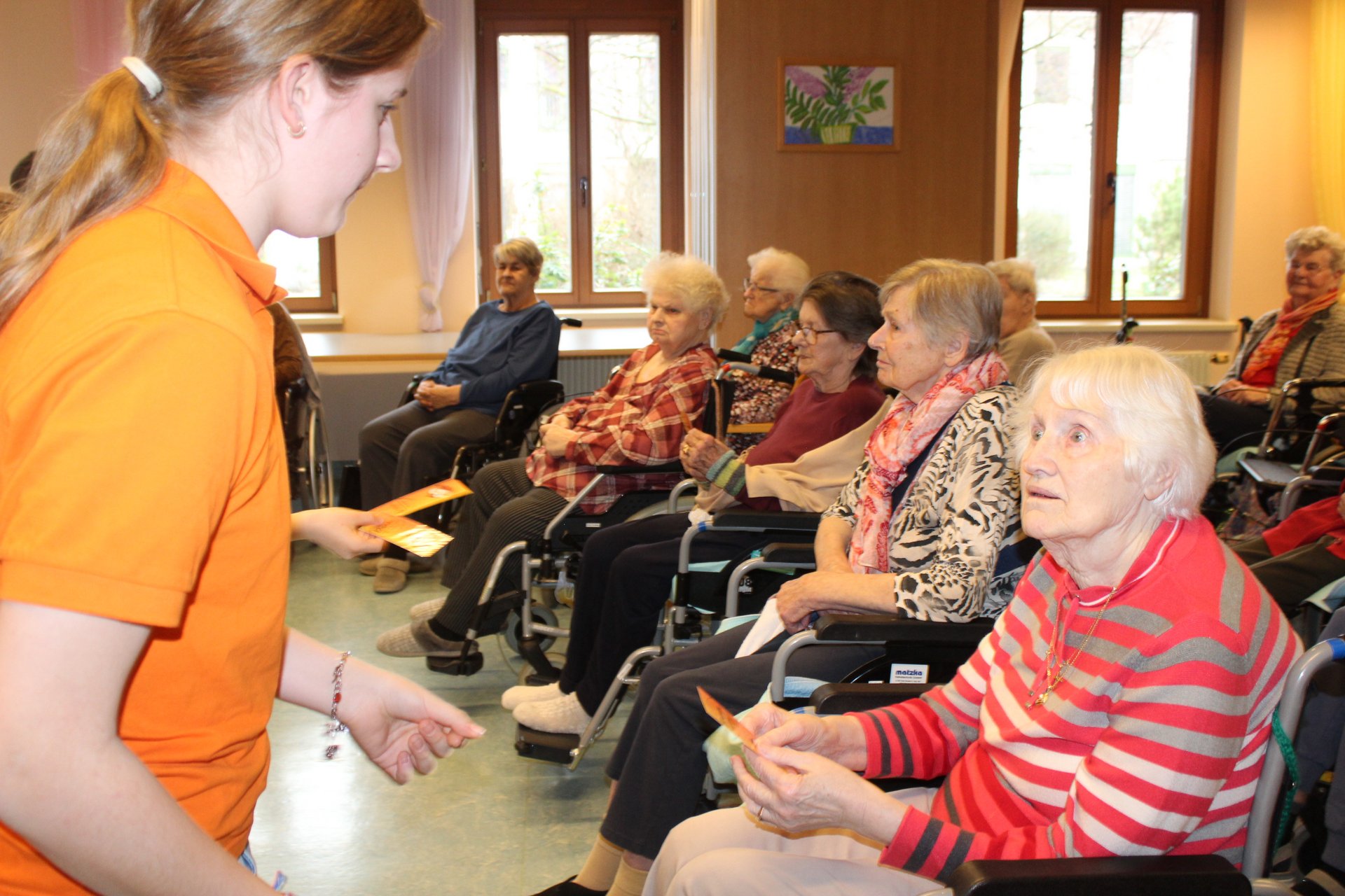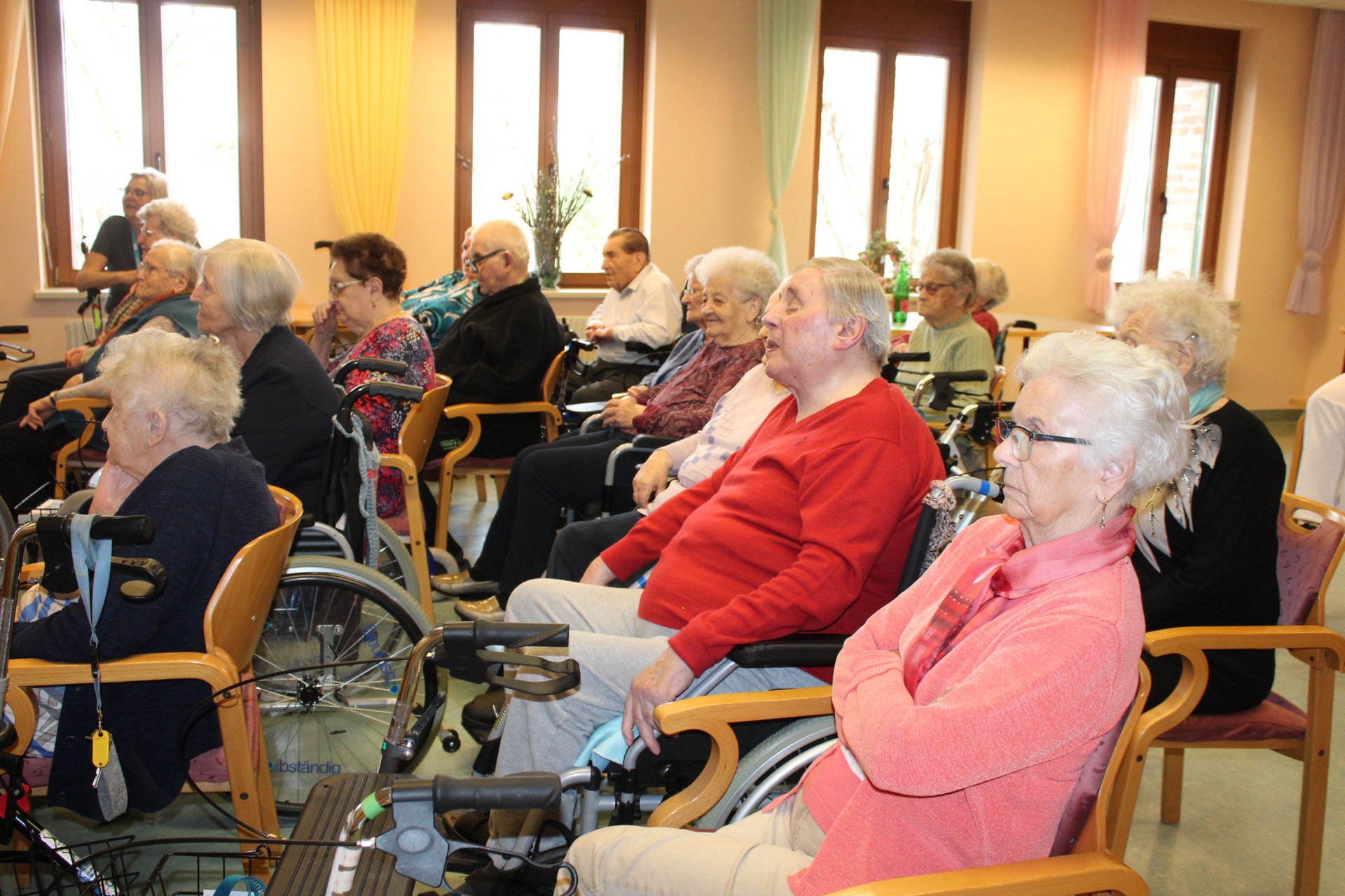 Eine Klasse der Musikmittelschule Laa kam zur Märchenstunde in unser Haus. Die Schülerinnen und Schüler holten unsere Bewohnerinnen und Bewohner von den Wohnbereichen in den Spiegelsaal. Es wurde eine große Runde. Viele bekannte Märchen wurden vorgelesen und es wurde gebannt zugehört. Man kann sich ja schon gar nicht mehr an die Märchen erinnern, stellten die Bewohnerinnen und Bewohner fest. Zur Erinnerung überreichten die Schülerinnen und Schüler unseren Bewohnerinnen und Bewohnern ein Lesezeichen. Danach wurden wieder alle auf die Wohnbereiche gebracht und es gab noch das eine oder andere Erinnerungsfoto.