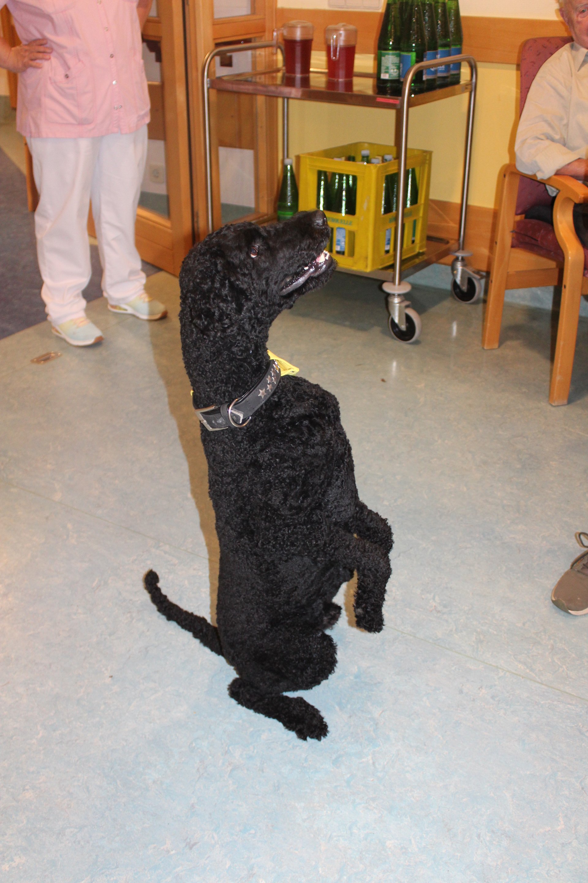 Q ist ein wunderschöner schwarzer Königspudel und kommt einmal im Monat auf jeden Wohnbereich und besucht die Bewohnerinnen und Bewohner.
