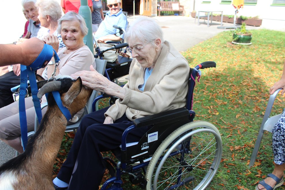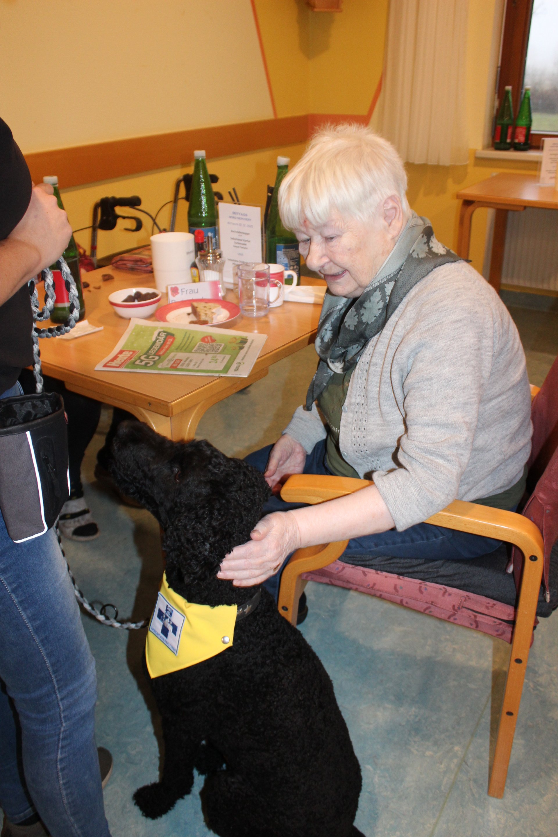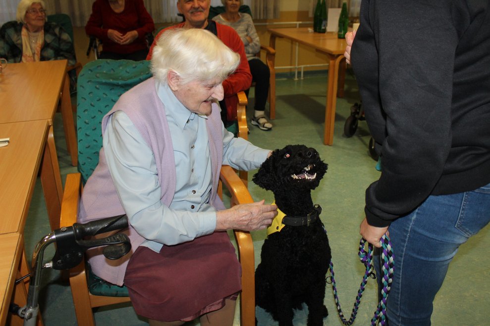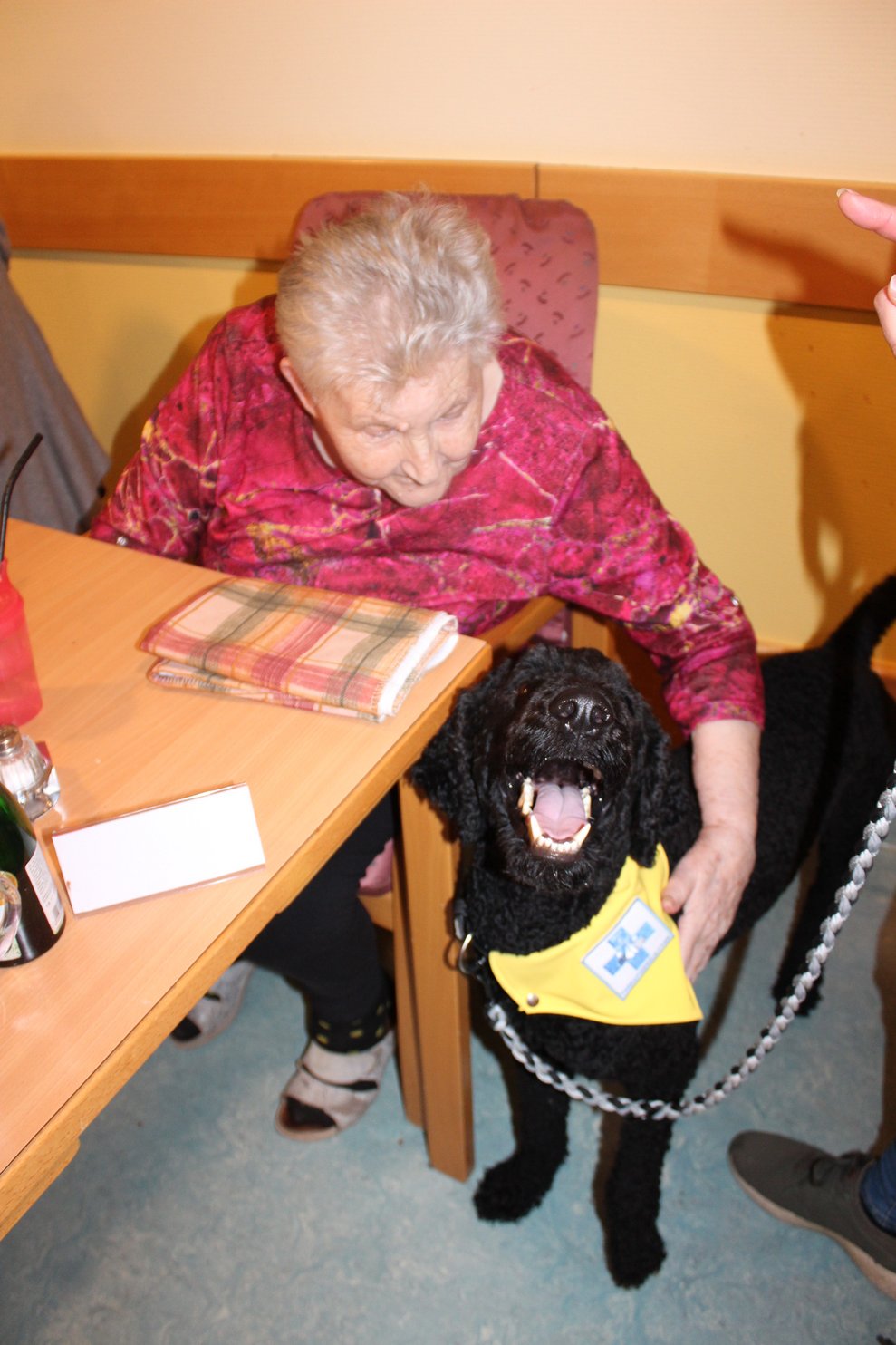 Man sieht wieviel Freude die Bewohnerinnen und Bewohner haben wenn Tiere ins Haus kommen. Die Herrschaften versammeln sich im Speisesaal und können mit Q spielen, ihn streicheln oder ihn mit kleinen Leckerlis belohnen. Q besucht auch die Bewohnerinnen und Bewohner in den Zimmern und zaubert vielen ein Lächeln ins Gesicht.