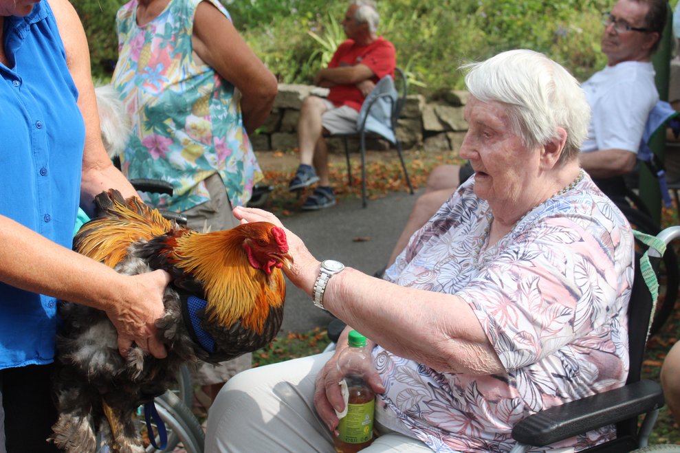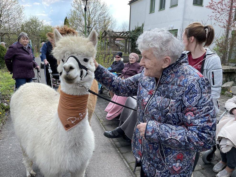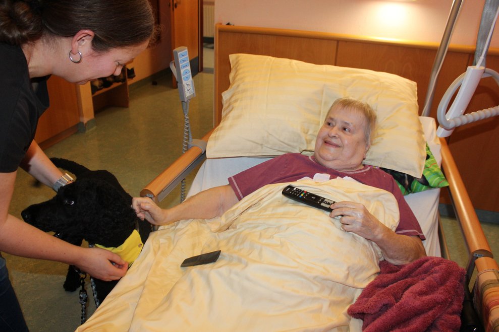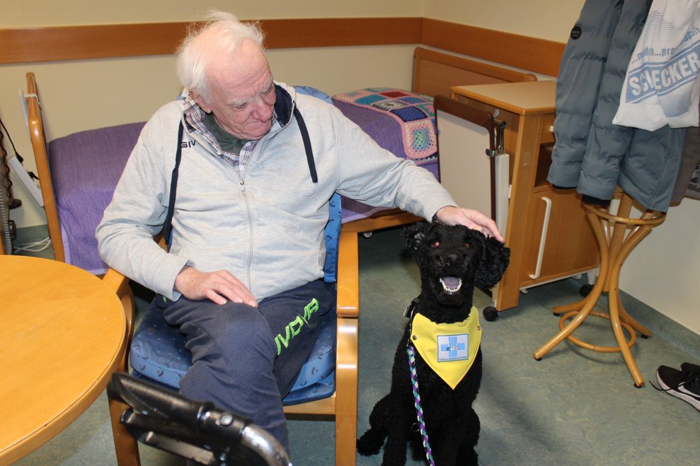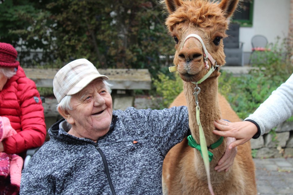 Man sieht wieviel Freude die Bewohnerinnen und Bewohner haben wenn Tiere ins Haus kommen. Die Herrschaften versammeln sich im Speisesaal und können mit Q spielen, ihn streicheln oder ihn mit kleinen Leckerlis belohnen. Q besucht auch die Bewohnerinnen und Bewohner in den Zimmern und zaubert vielen ein Lächeln ins Gesicht.