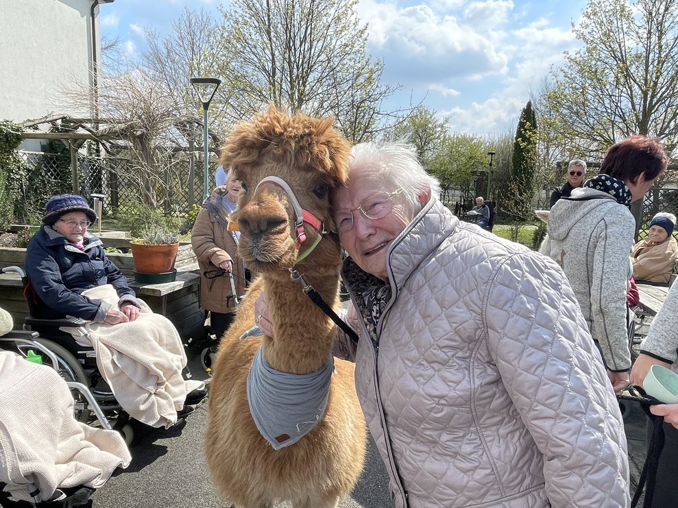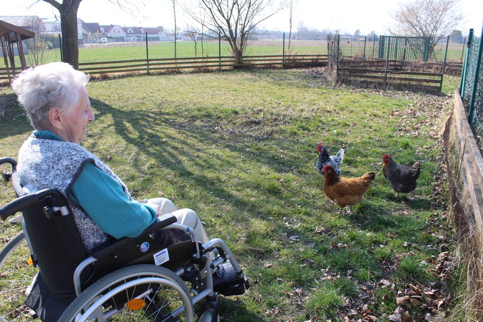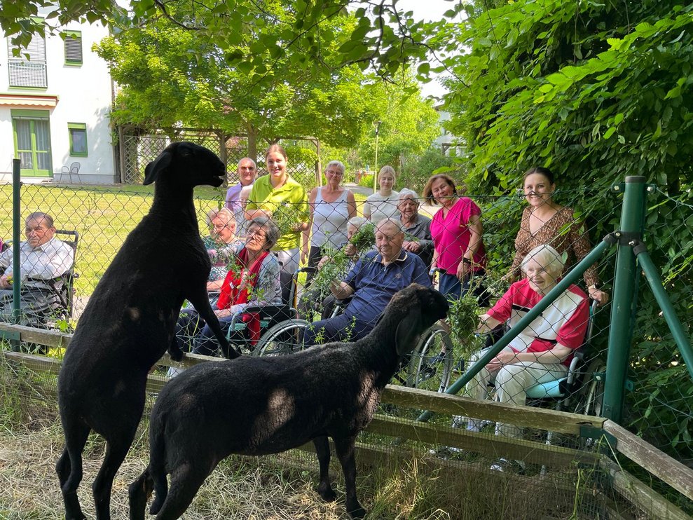 Das Tiergehege bietet regelmäßig diversen Tieren eine vorübergehende Heimat. Hühner oder Schafe ziehen jedes Jahr über den Sommer dort ein und erfreuen die Bewohnerinnen und Bewohner. Die Tiere werden gerne besucht und gefüttert. Wir freuen uns immer über "tierische Gäste" bei uns im Garten. Man sieht wieviel Freude die Tiere den Bewohnerinnen und Bewohnern machen, und unseren "Mitbewohnern" geht es natürlich sehr gut bei uns. Sie werden täglich gefüttert und versorgt, sodass es ihnen an nichts fehlt!